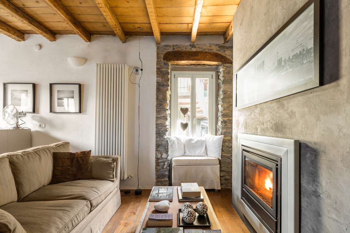 Spend evenings on the rooftop terrace, sipping wine as the town’s lights dance across the lake. The terrace features sun loungers and a dining set shaded by a large umbrella and pergola. Inside, the three-story home boasts a charming rustic-contemporary interior with warm wooden accents and high ceilings. On the ground floor, guests can relax and recharge in the living room, where an antique fireplace and two couches create a cozy atmosphere.