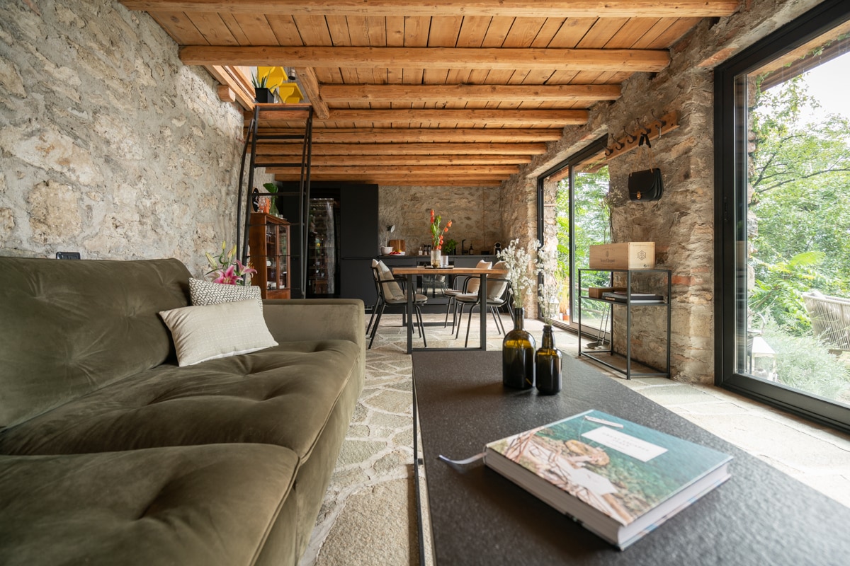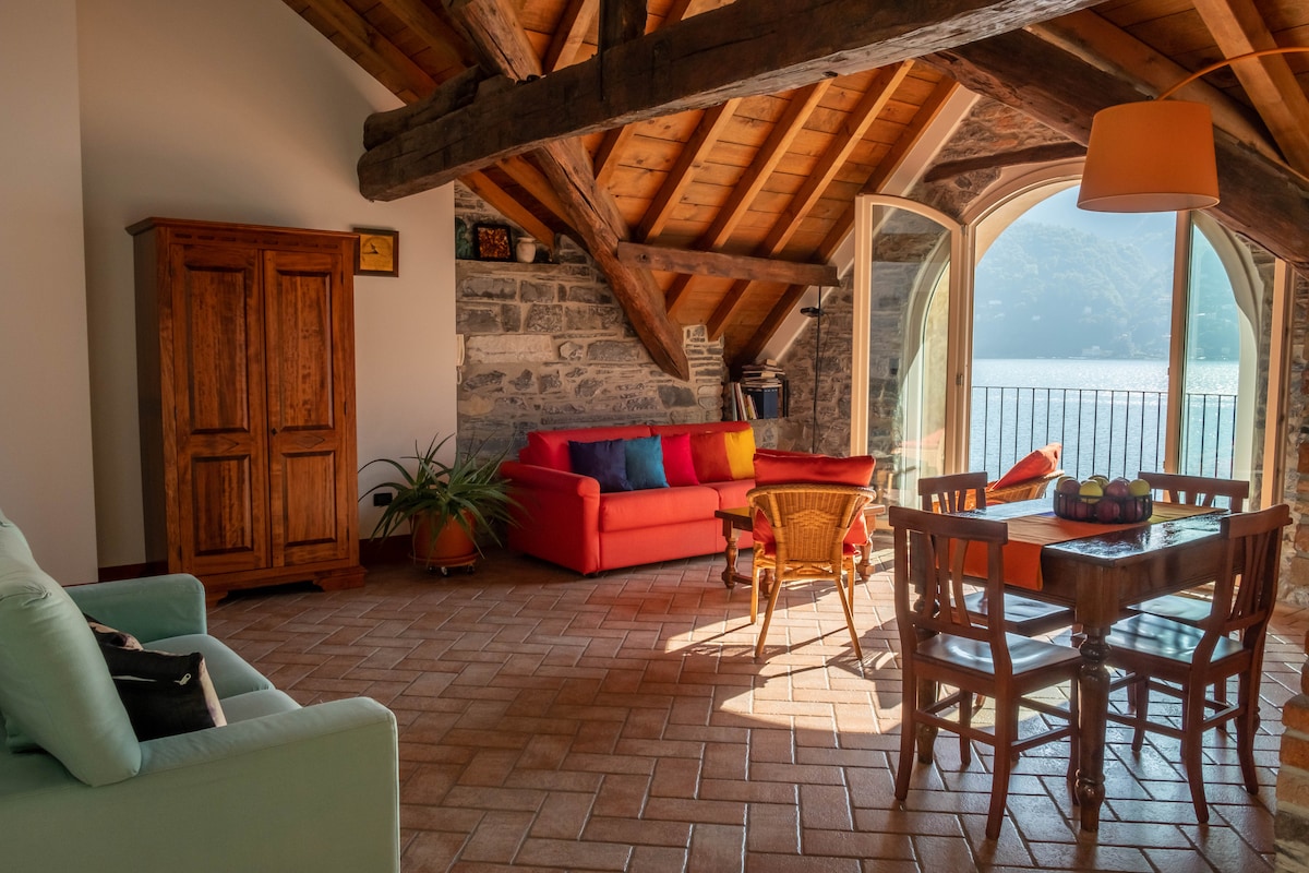 Perfect for solo travelers or couples, this cozy penthouse features textured exposed stone walls, vaulted ceilings, and wood beams blended with contemporary furnishings to create a comfortable space while preserving the charming historic feel of the renovated 19th-century villa. The home features an open-concept layout with a quaint full kitchen, a four-person dining table, and a living room with French doors that open to lake views.