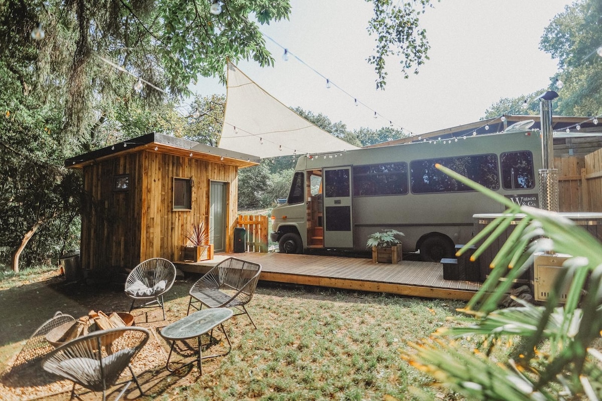 You may not be a rock star, but that doesn’t mean you can’t live like one. This old tour bus in Alton offers the perfect escape for those seeking glamping at its finest. The vintage van is enclosed by a fence, ensuring privacy and a cozy atmosphere. After riding coasters at Alton Towers, relax under a blanket of stars in the private hot tub or sip wine beside the fire pit. The highlight of this English Airbnb is the treetop cinema area — complete with suspended netting, a canvas cover, and a large projector screen for an unforgettable movie experience. When it’s time to wind down, head inside the tour bus to relax on the sofa bed or curl up in the plush double bed.
