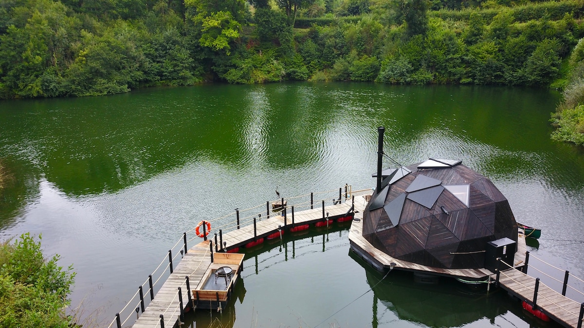 Like a scene from a futuristic movie, this floating one-bedroom dome is one of the most unique and impressive Airbnb rentals in England. Handcrafted from bare timber, the dome sits in the middle of a private lake within a vineyard beside Dartmoor National Park, offering easy access to hiking trails, wine tastings, horseback riding tours, and an on-site restaurant. Stroll along the boardwalk to the dome, where you can relax by the fire in cozy beanbag chairs or curl up in the plush king-size bed for a nap. When the weather’s good, step out onto the boardwalk patio to paddle the lake by kayak, sip wine by the outdoor firepit, or lounge on the suspended net hammock hovering above the water.